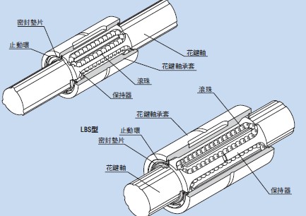 ? 同時,即使代替直線滾珠襯套使用時,因在軸徑相同的情況下,滾珠花鍵所具有的額定負荷是線性襯套 的十幾倍,所以能使宣十輩得十分小巧。即使在憨臂負荷、力矩等作用的情況下,也可安全使用,而且壽命長。