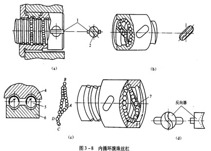 如圖3-7(a)所示是端蓋式,在螺母上加工出一縱向孔,作為滾珠的回程通道,螺母兩端的蓋板上開有滾珠的回程口,滾珠由此進(jìn)入回程管,形成循環(huán)。