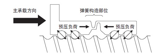 此型號(hào)以單螺母的中央部作為彈簧結(jié)構(gòu)來移動(dòng)相位,通過定壓預(yù)壓方式實(shí)現(xiàn)無效行程為零。定壓預(yù)壓方式使?jié)L珠絲杠吸收節(jié)距誤差及偏心并實(shí)現(xiàn)平穩(wěn)的運(yùn)動(dòng)。